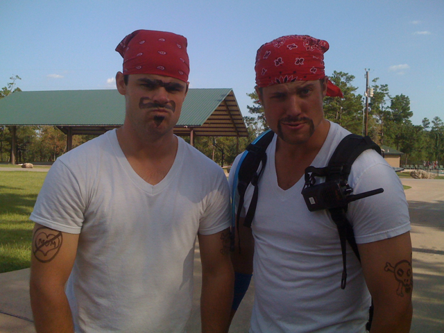 Hello Agian from Texas, as internet has not been my best friend, I realize I have missed a few days here and there. Today I would like to share a picture of Bradley and myself. Here at Wyldlife Camping, we have what we call Pirate/Princess night. This is where we split up the camp and send the guys away with all the guys to go do, "guy things" like caber tossing, arm wrestling, tug o war and eat bbq with our hands... oh yeah and dress up like pirates. The ladies go do princess things, that, I am not to sure about what they do. Bradley and I decided to join in on the fun and dress up like pirates as well. Above you will find a picture of what that looked like. I must say, it was a ton of fun and we look like bad "a" pirates.